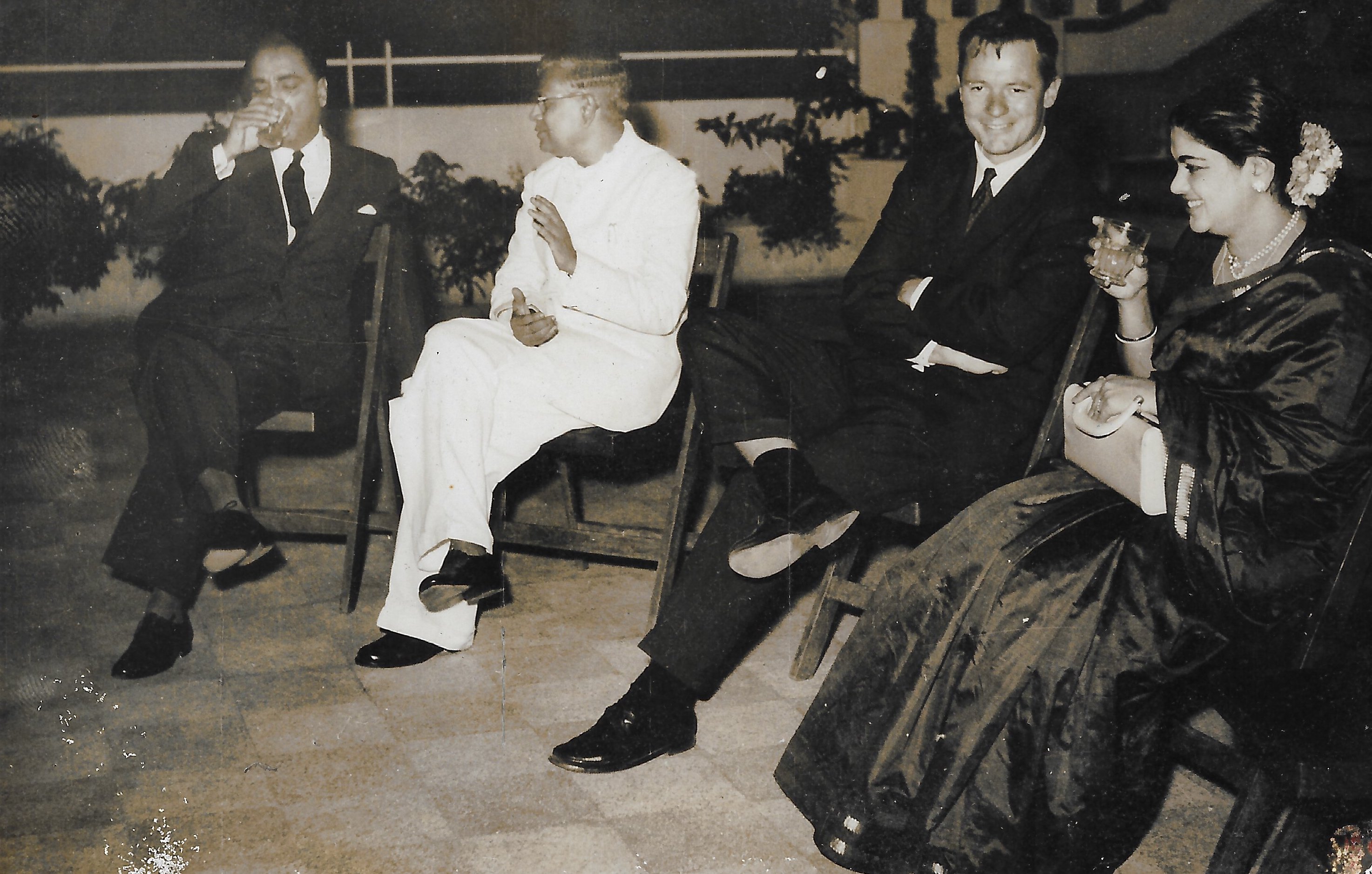 (L to R) Dr. Bhabha enjoying a pre-dinner drink and in conversation with Mr. R. Venkataraman, Minister for Education. Prof. Henry Stapp (Berkeley) in conversation with Lalitha Ramakrishnan.
