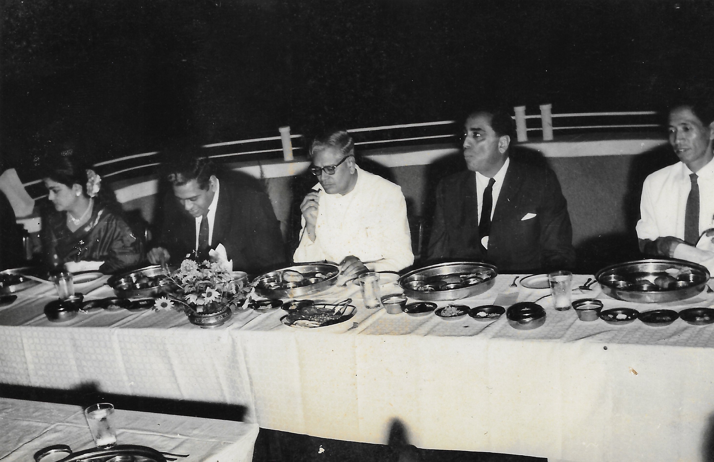 (L to R) Lalitha Ramakrishnan, Alladi Ramakrishnan, Minister for Education R. Venkataraman, and Dr. Homi Bhabha, at dinner on the Roof Garden of Hotel Dasaprakash.