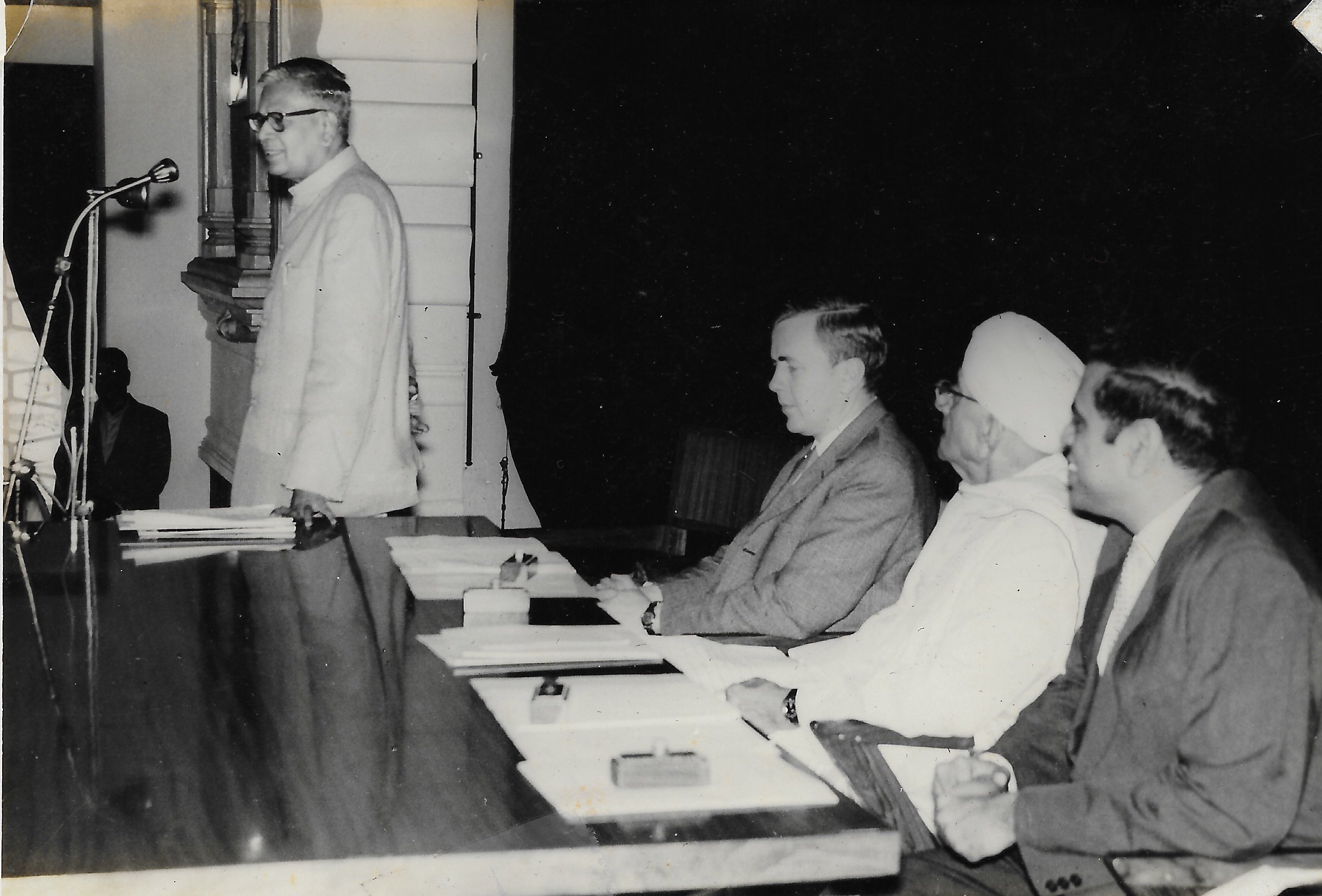 Sir C. P. Ramaswami Iyer delivering a lecture on "The discovery of zero by the Hindus" at the Fourth Anniversary Symposium. Gunnar Kallen, R. Venkataraman, and Alladi Ramakrishnan, listening.