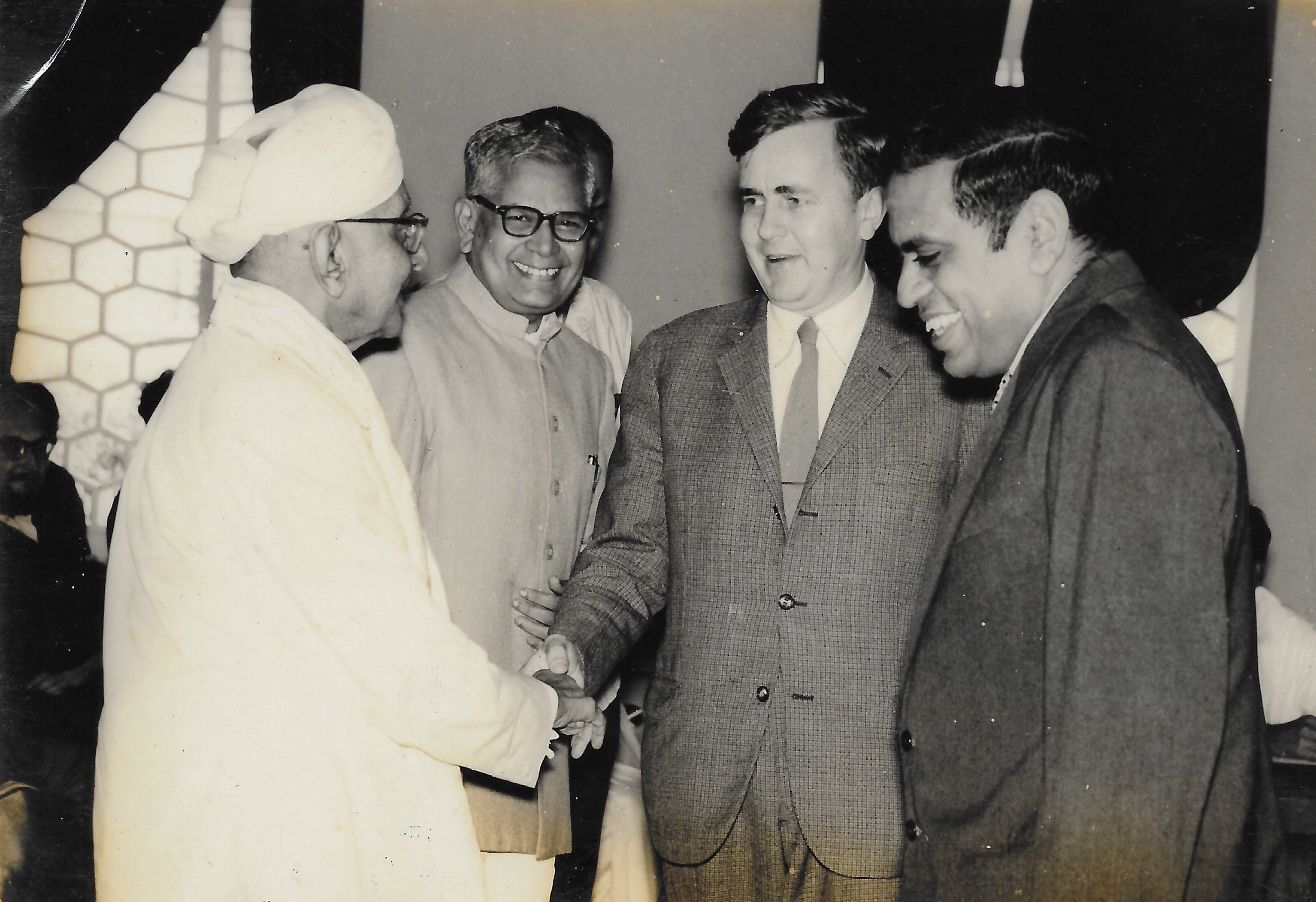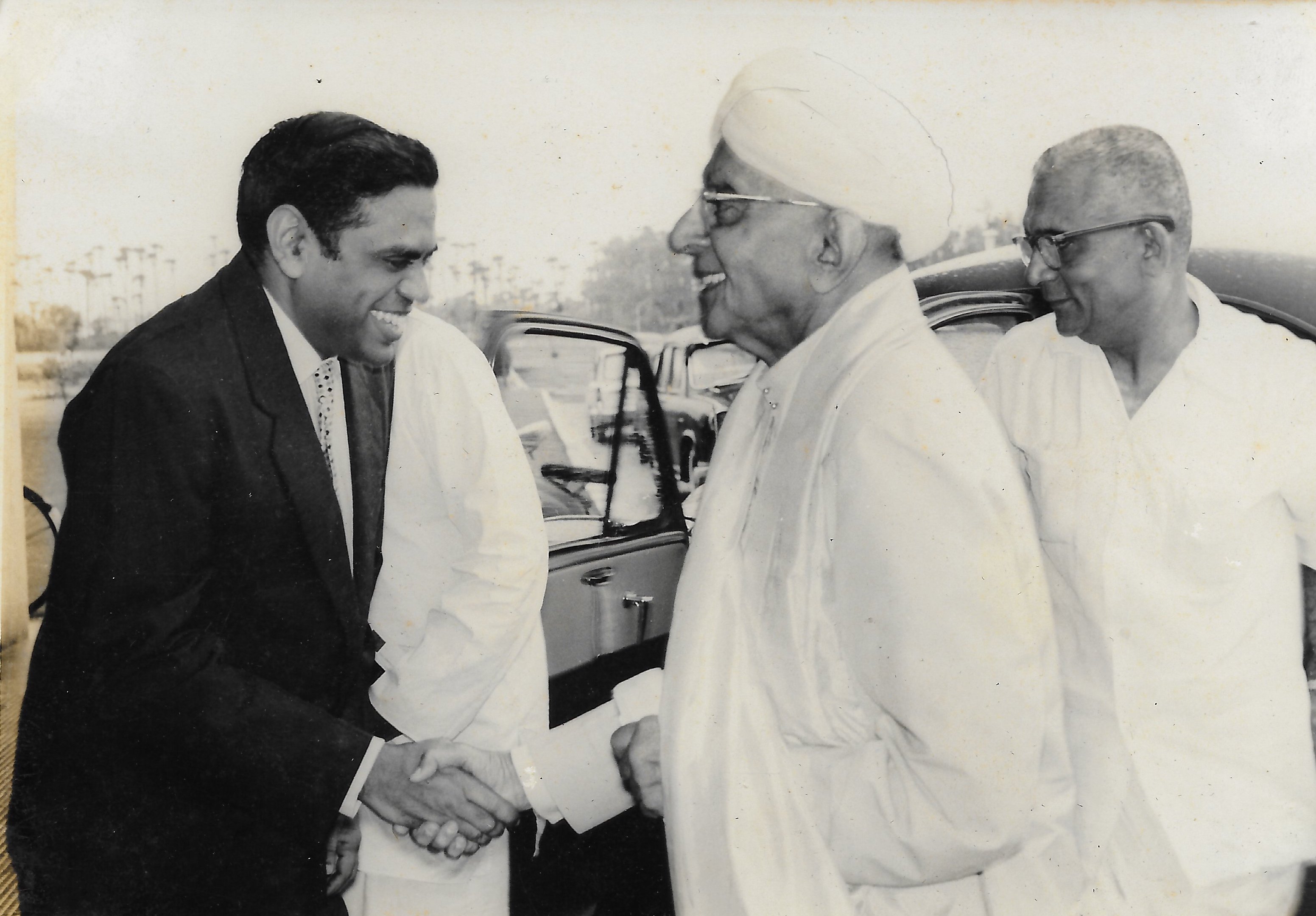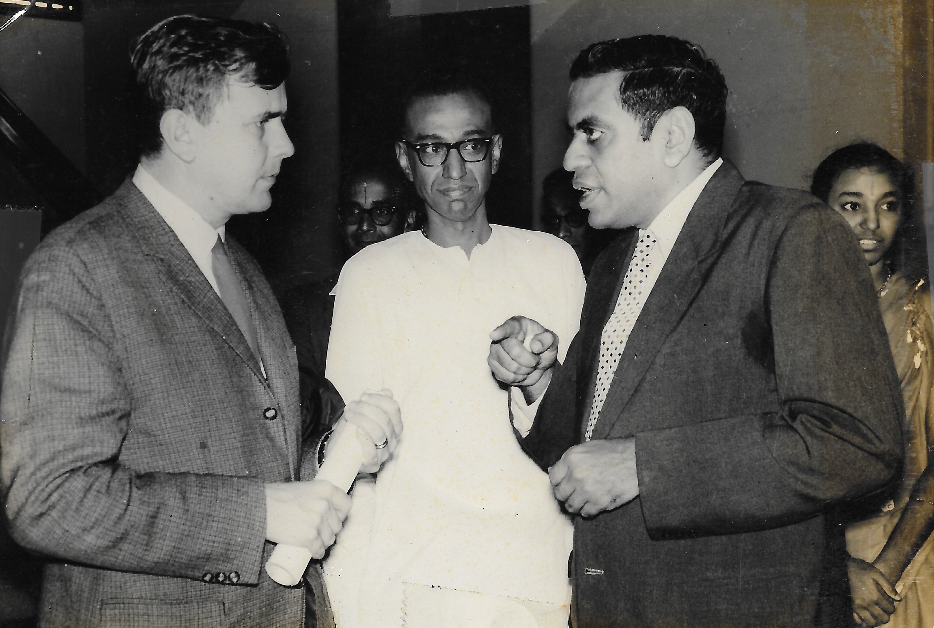 Alladi Ramakrishnan introducing Prof. Gunnar Kallen to Sir C. P. Ramaswami Iyer. Mr. R. Venkataraman, Minister of Education, looking on.