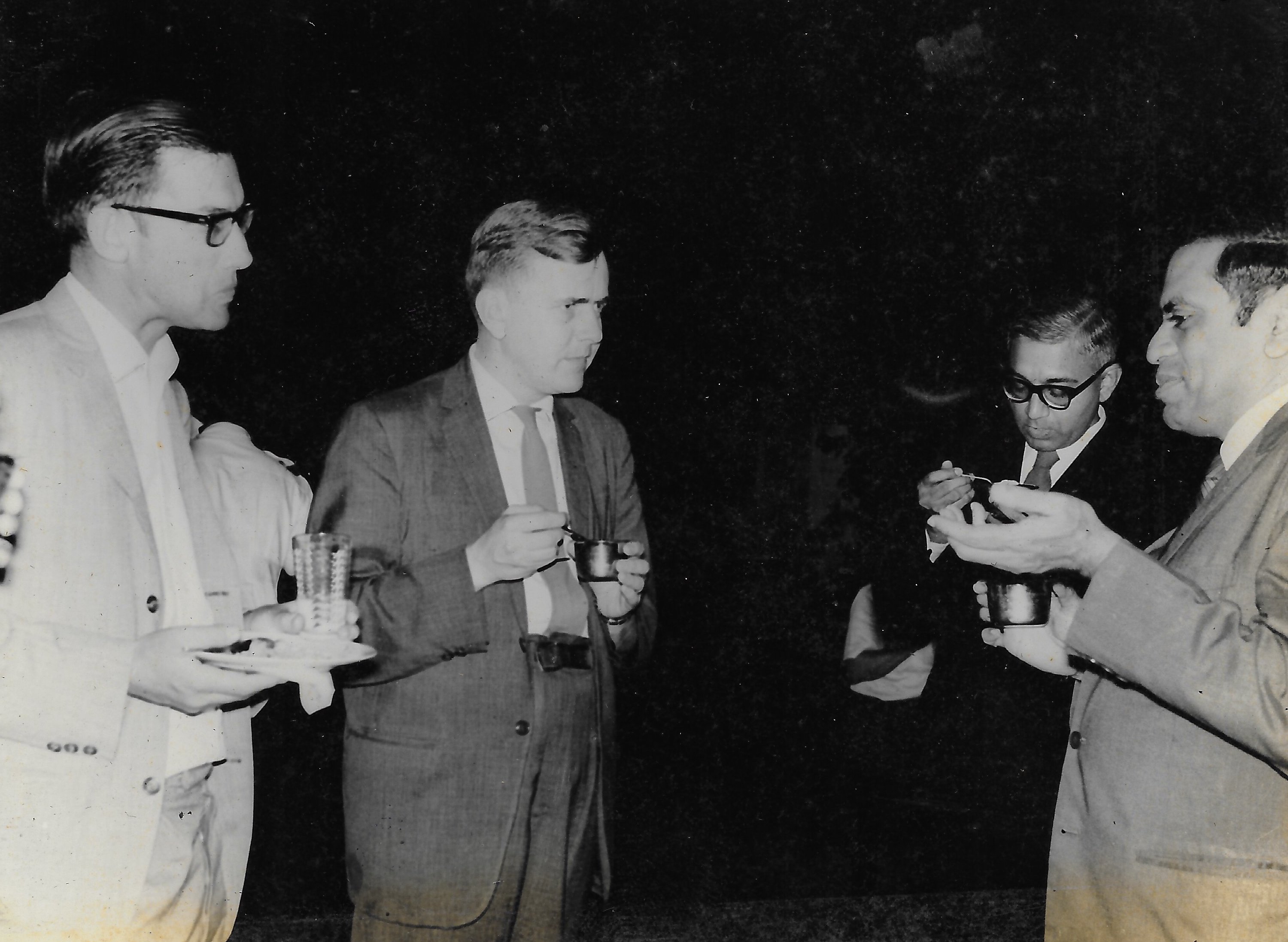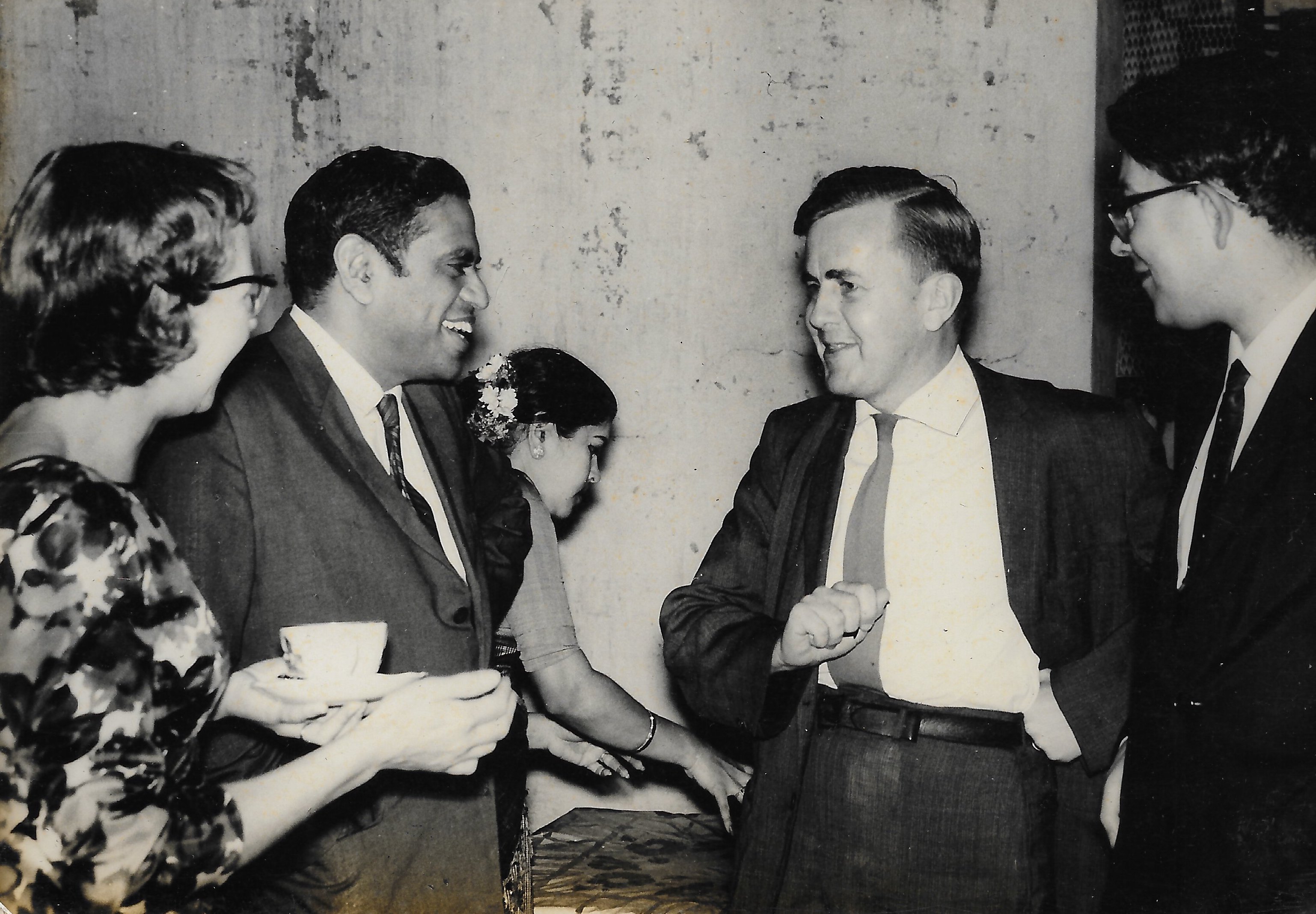 Alladi Ramakrishnan in conversation with Gunnar Kallen. Ramakrishnan's friend Arunachalam Chettiar looking on.