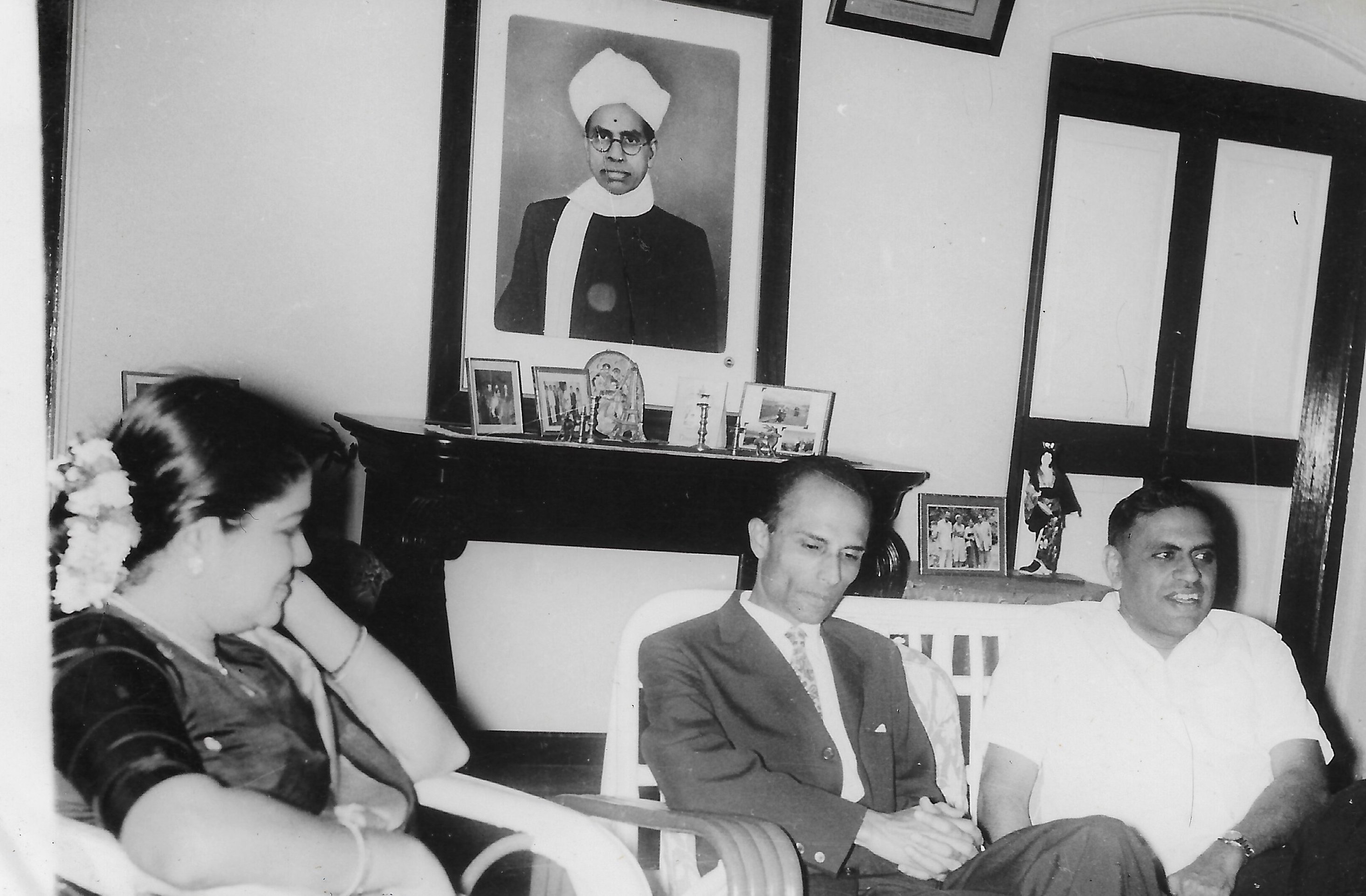 Lalitha and Alladi Ramakrishnan with Prof. Harish Chandra (centre) in the drawing room of Ekamra Nivas.