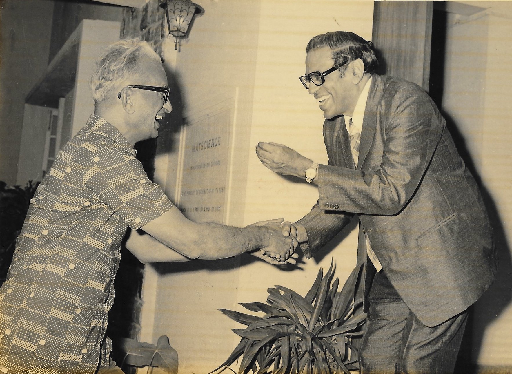 Alladi Ramakrishnan welcoming Malcolm Adiseshiah, Vice Chancellor of Madras University, to Matscience.