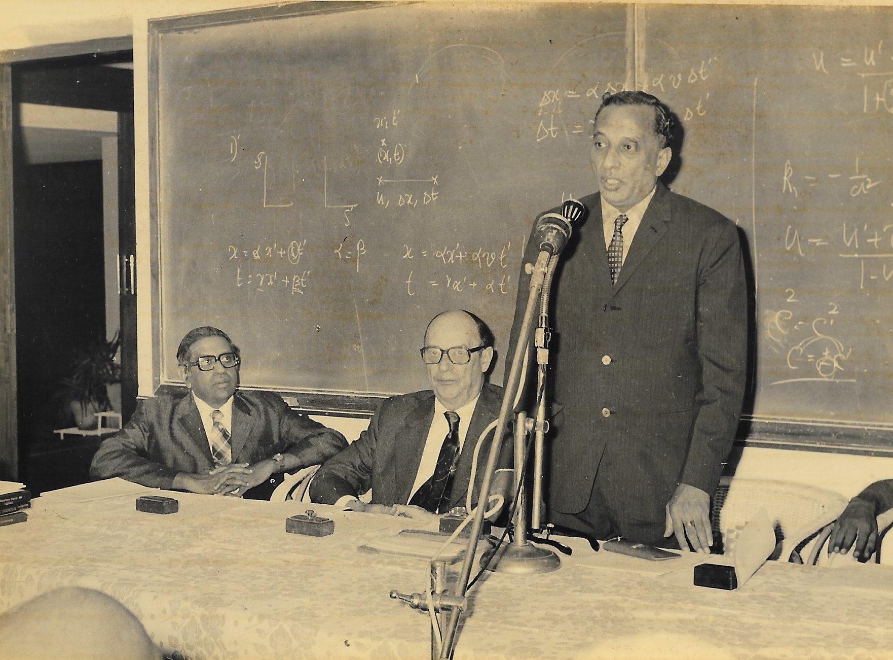 Director Alladi Ramakrishnan speaking. Listening to him are (L to R): Nobel Laureate John Bardeen, Advisor to the Madras Government R. V. Subramaniam, and Madras University Vice-Chancellor Malcolm Adiseshiah.