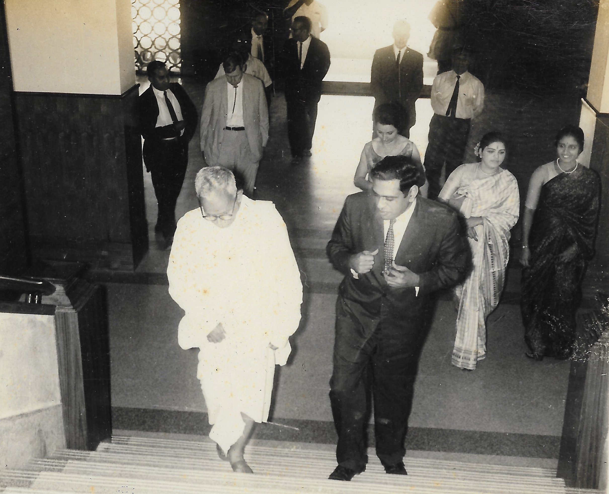 Director Alladi Ramakrishnan and Chief Minister Bhakthavatsalam walking up the stairs at the Presidency College for the Second Anniversary of Matscience. walking behind Bhakthavatsalam is Ramanujan Visiting Professor Marshall Stone. Walking behind Ramakrishnan are Mrs. Stone and Lalitha Ramakrishnan.