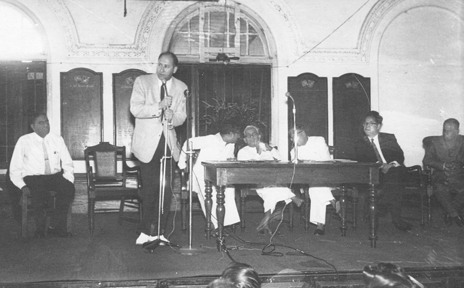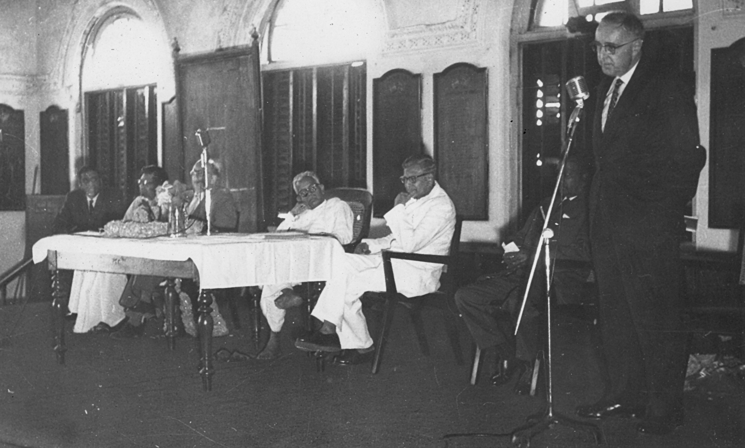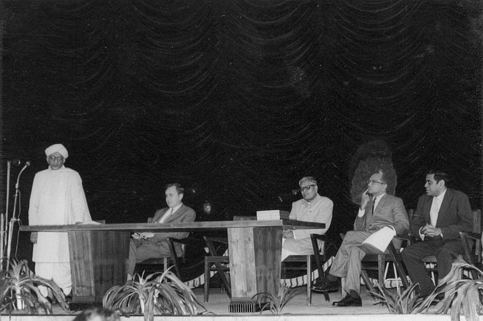 Provost McCrea Hazlett of the University of Rochester delivering the Anniversary Address of MATSCIENCE in Febuary 1964. Seated on the dais are the Ministers of the Madras Government, Niels Bohr Visiting Professor L. Rosenfeld, and Director Alladi Ramakrishnan