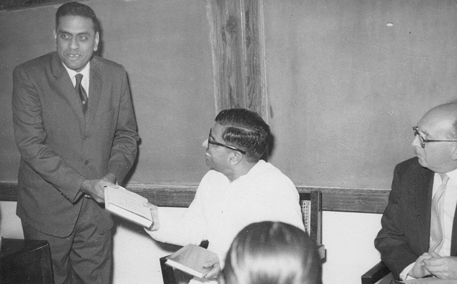 Professor Alladi Ramakrishnan presenting his book "Elementary Particles and Cosmic Rays" to Education Minister C. Subramaniam who inaugurated the Second MATSCIENCE Anniversary Symposium in Jan 1964. Seated to the right is Niels Bohr Visiting Professor L. Rosenfeld (Copenhagen) who gave the opening lecture at the Symposium.