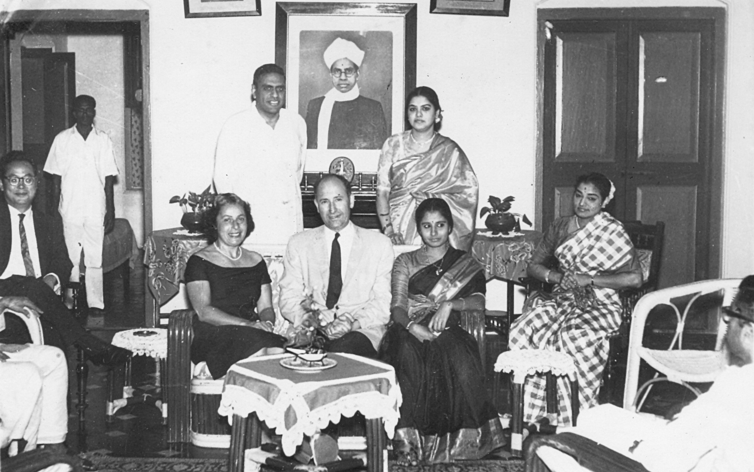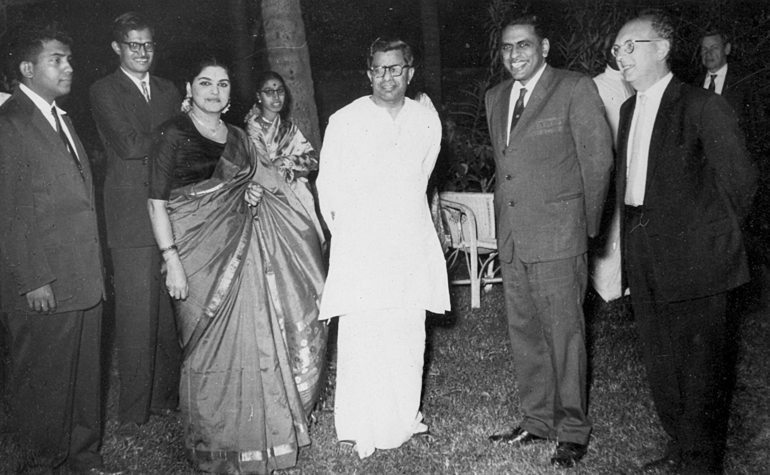 Professor Rosenfeld of Copenhagen at Ekamra Nivas with Alladi Ramakrishnan, Lalitha Ramakrishnan, Minister C. Subramaniam and other guests in January, 1964
