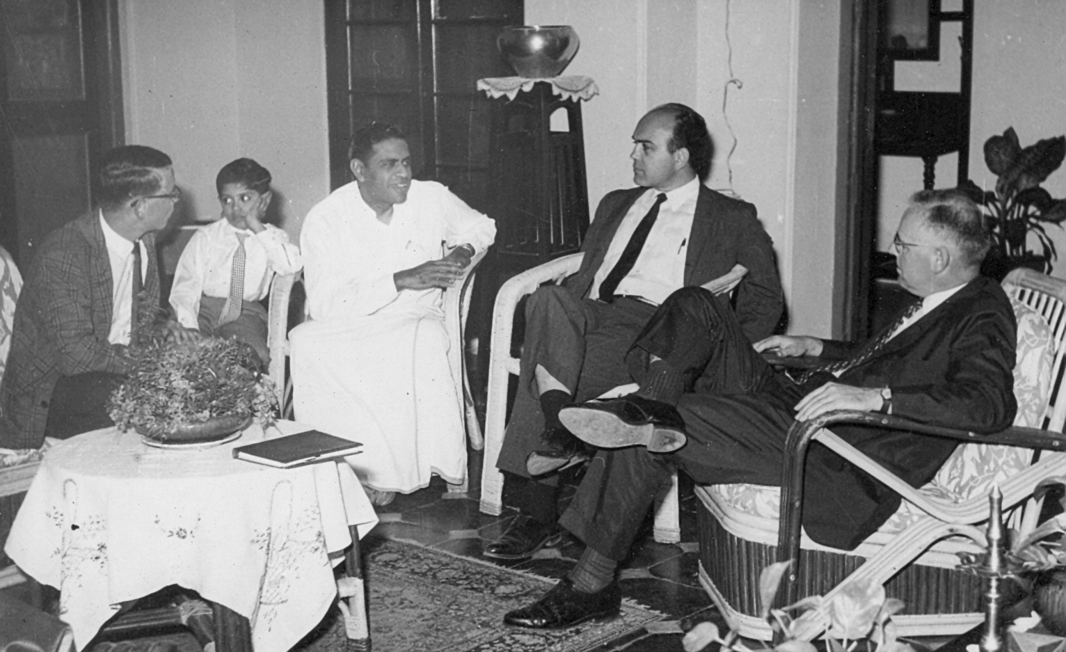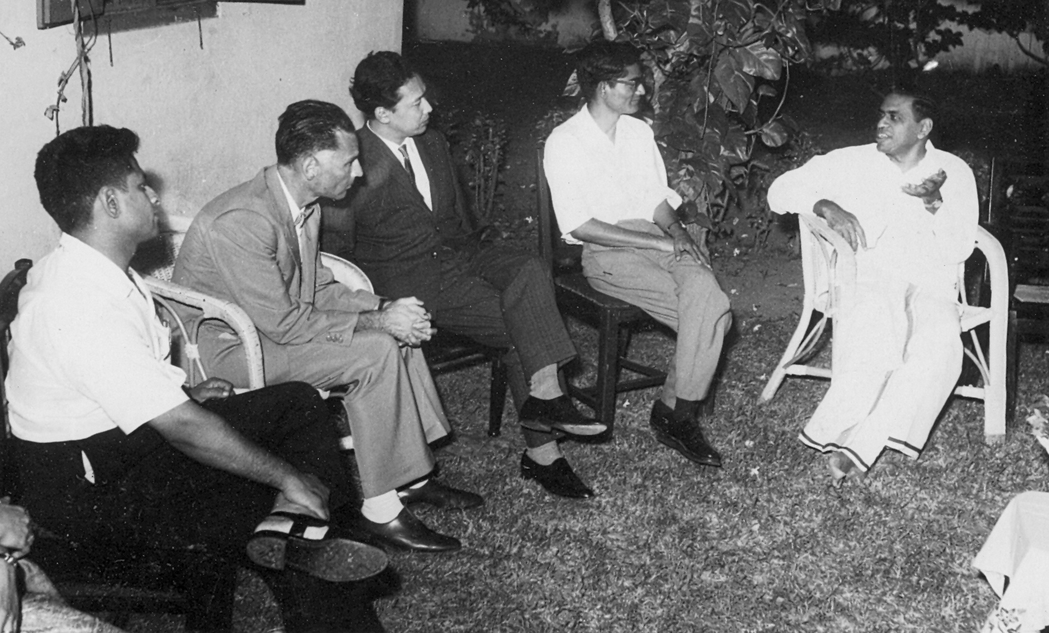 Professor Leonard Schiff of Stanford University at Ekamra Nivas, Febuary 1963. Schiff released the First Anniversary Report of MATSCIENCE and gave a series of lectures on gravitation. Seated next to Schiff is Justice Patanjali Sastry, former Chief Justice of the Supreme Court of India. Justice Sastry, a neighbor of Alladi Ramakrishnan, did his apprenticeship under Sir Alladi Krishnaswami Iyer, Ramakrishnan's father.