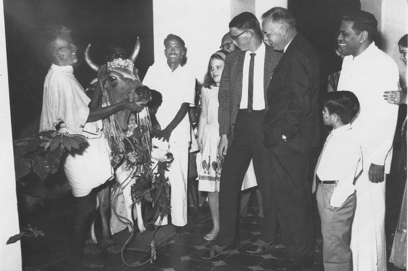The Hazletts are in Madras during the Pongal (harvest) season. At Ekamra Nivas, on Pongal Day, the staff of Alladi Ramakrishnan show the Hazletts the family cow all decorated! (January, 1964)