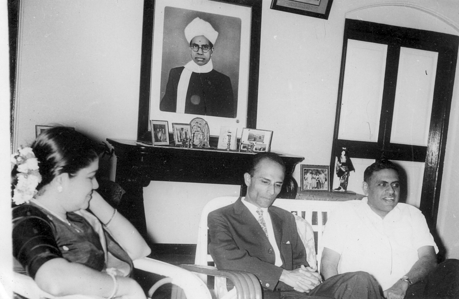 The eminent physicist Robert Marshak and Mrs Marshak with Alladi and Lalitha Ramakrishnan and other guests at Ekamra Nivas (January, 1963). Professor Fukuda (Japan) is also in the picture.
