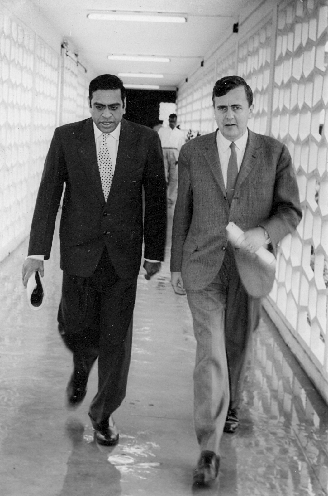 Alladi Ramakrishnan walking with eminent Swedish physicist Gunnar Kallen towards the auditorium where Kallen gave the inaugural address of the Fourth Anniversary Symposium of MATSCIENCE on January 2, 1966.