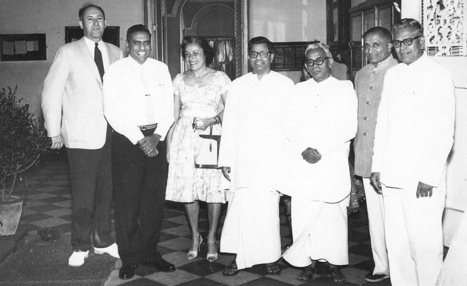 Professor and Mrs. Marshak (University Rochester) at MATSCIENCE with Director Alladi Ramakrishnan, Finance Minister C. Subramaniam, Chief Minister M. Bhakthavatsalam and Education Minister R. Venkataraman. (January, 1963)