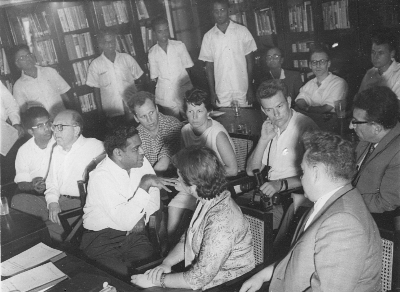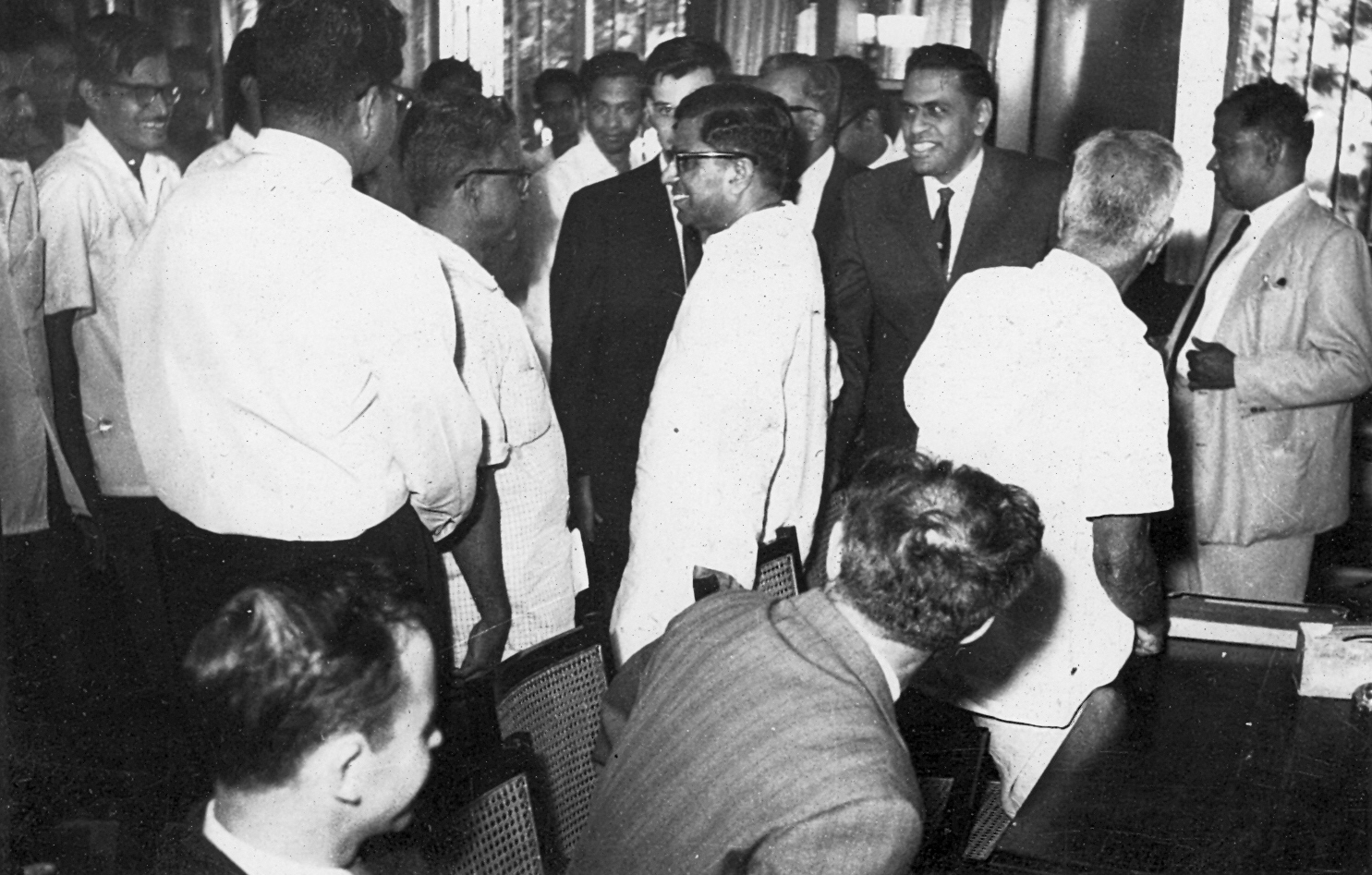 Professor Alladi Ramakrishnan leading a discussion with Russian visitors during a seminar at MATSCIENCE in December, 1963. Seated next to Alladi Ramakrishnan is Professor Rosenfeld from Sweden, who was Niels Bohr Visiting Professor.