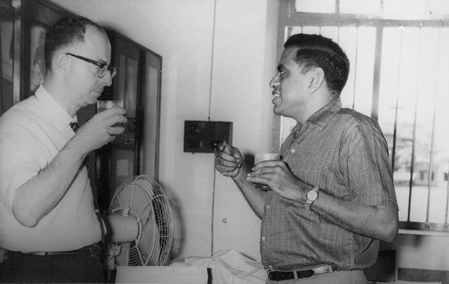 Alladi Ramakrishnan in discussion at MATSCIENCE with Dr. Maurice Shapiro of the U.S. Naval Research Labs in December, 1963. It was Shapiro's visit to the Theoretical Physics Seminar September, 1961 and his comments that prompted Minister C. Subramaniam to urge Prime Minister Nehru to meet Ramakrishnan and his students.