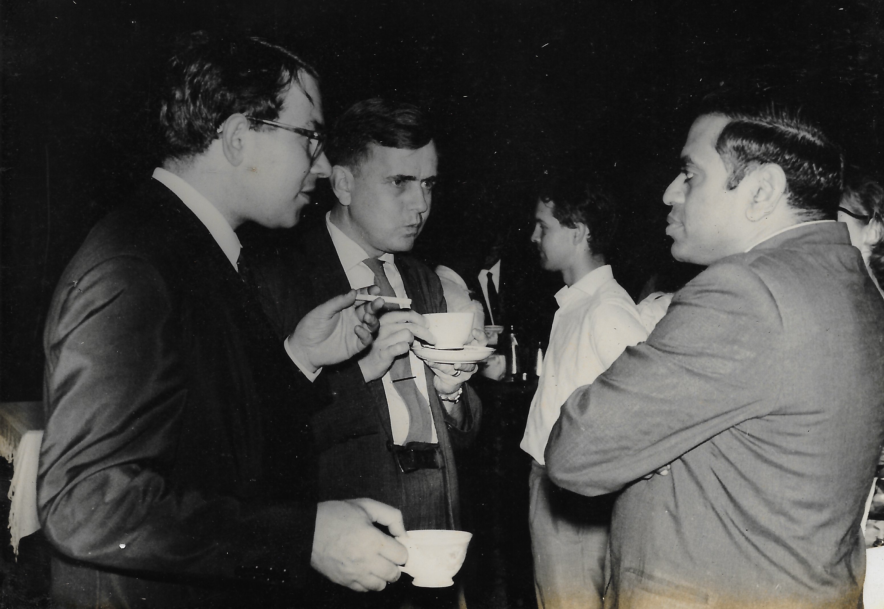 Alladi Ramakrishnan in conversation with Gunnar Kallen. Ramakrishnan's friend Arunachalam Chettiar looking on.