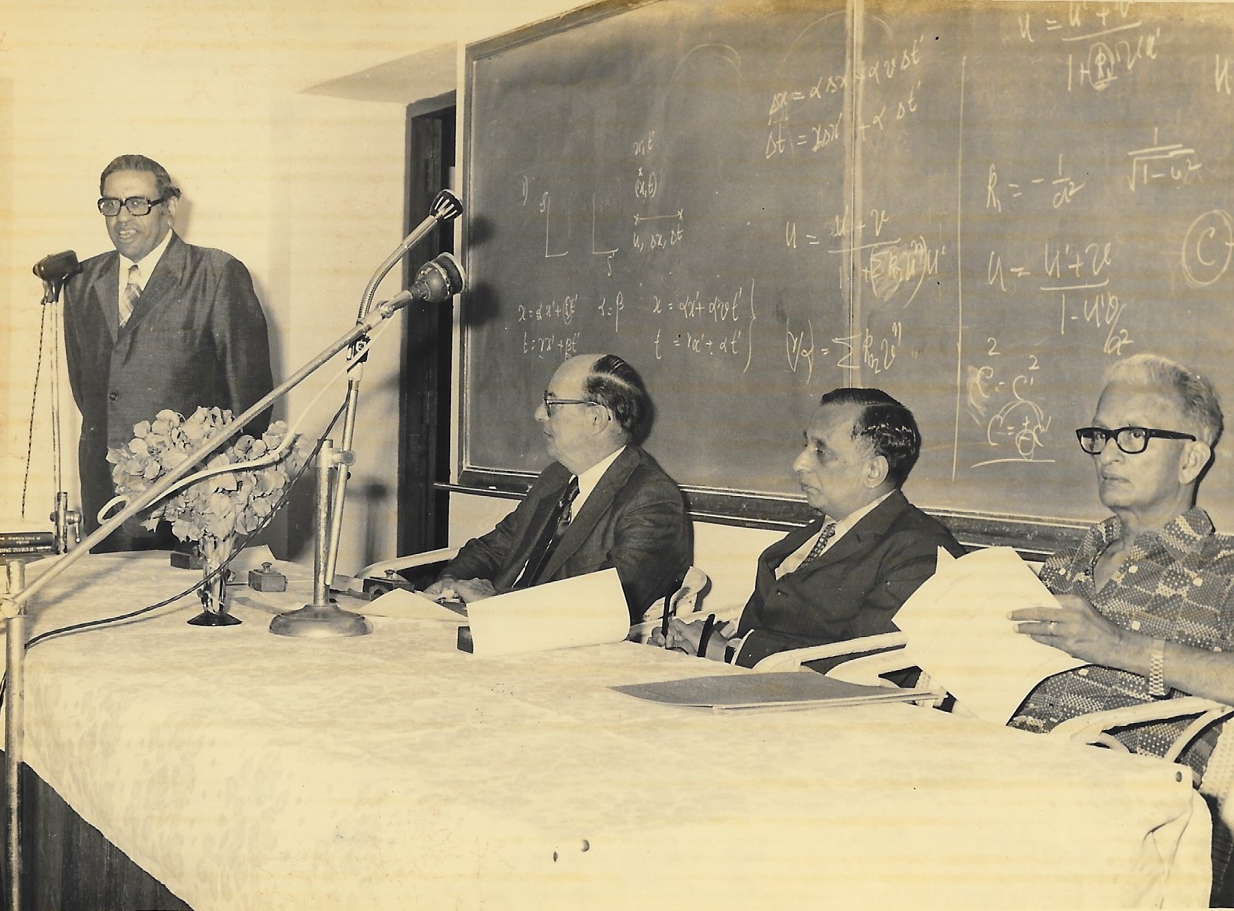 Director Alladi Ramakrishnan speaking. Listening to him are (L to R): Nobel Laureate John Bardeen, Advisor to the Madras Government R. V. Subramaniam, and Madras University Vice-Chancellor Malcolm Adiseshiah.