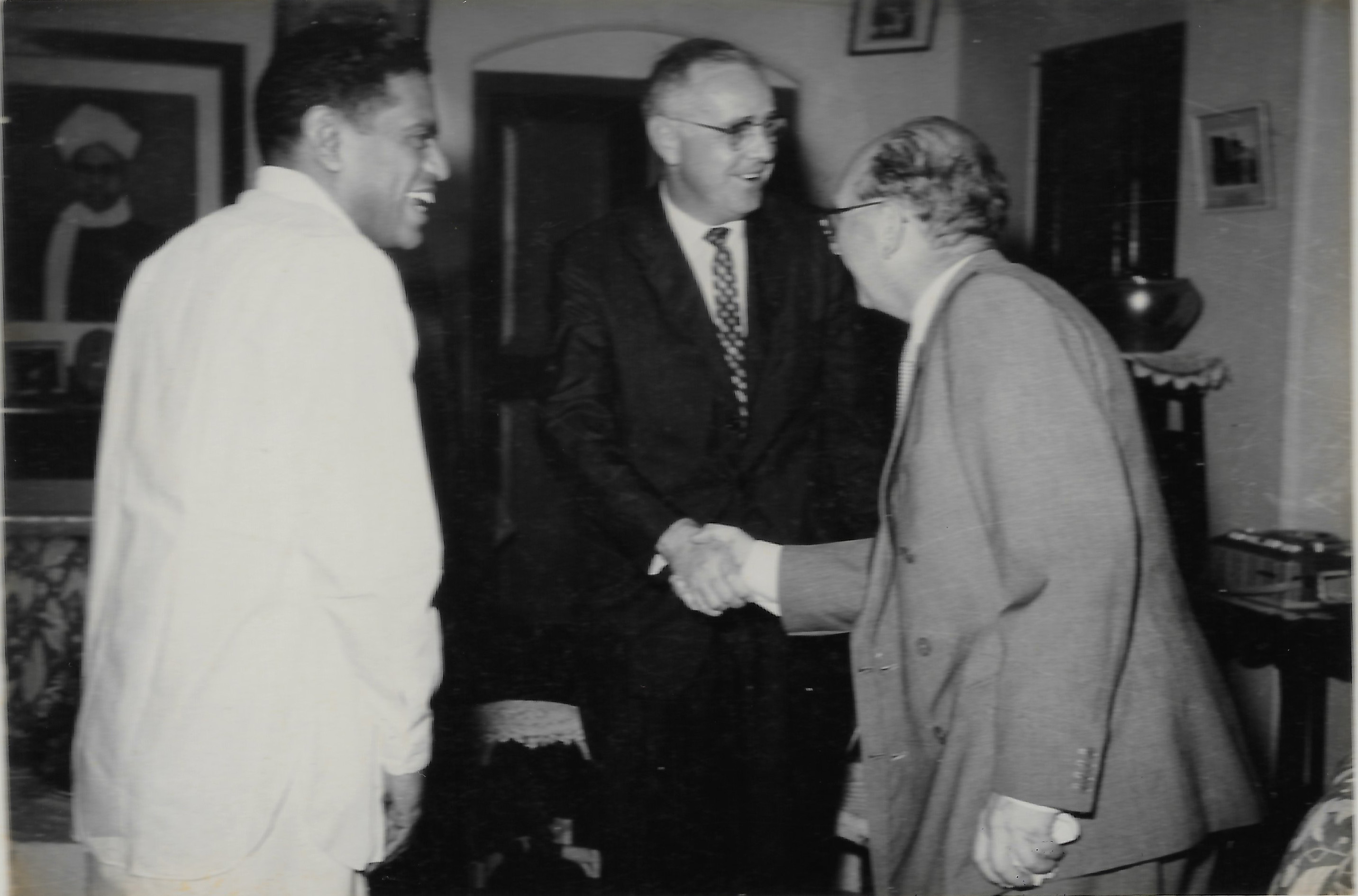 Alladi Ramakrishnan and McCrea Hazlett welcoming Leon Rosenfeld at Ekamra Nivas.