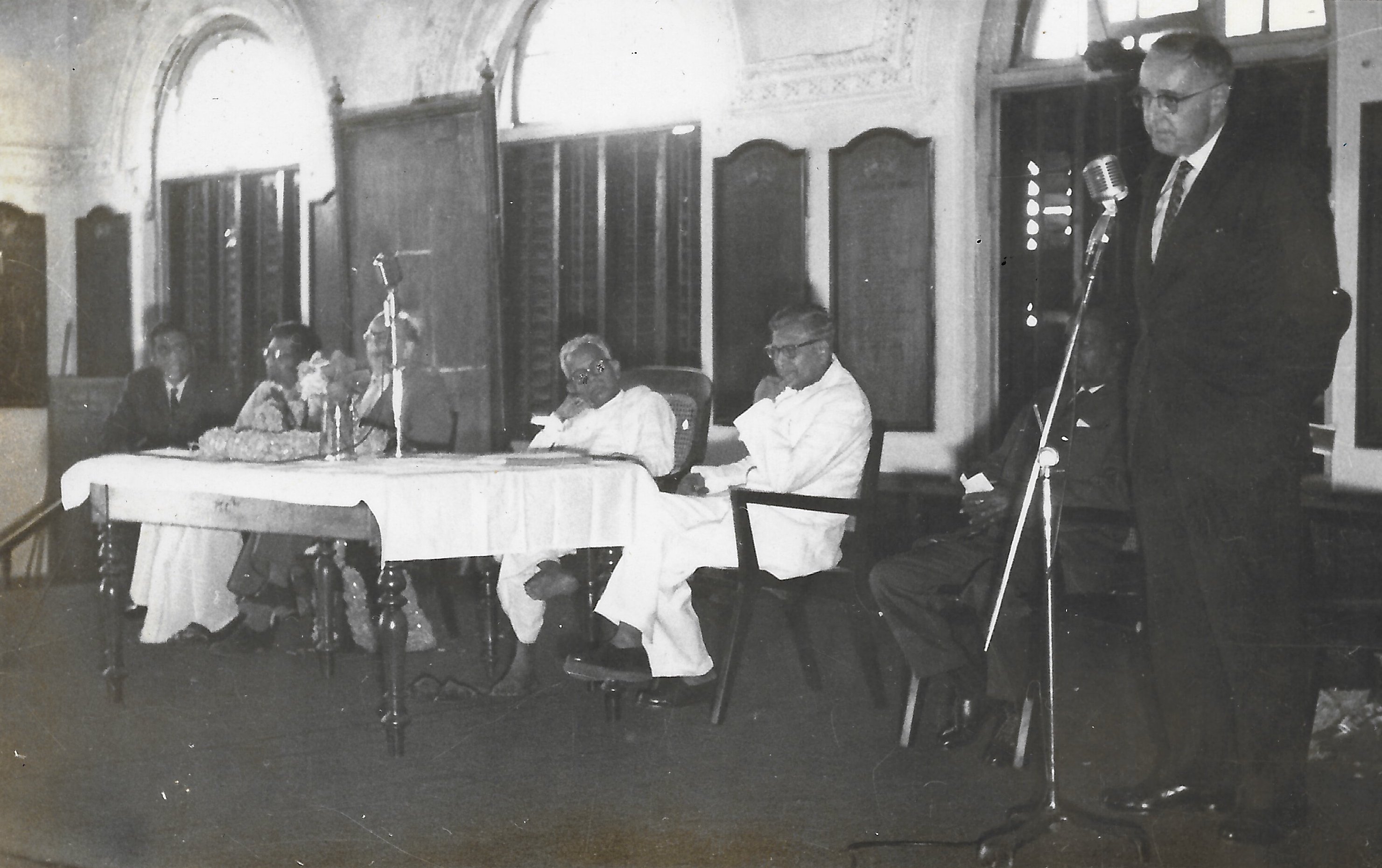 McCrea Hazlett delivering the Anniversary Address at Matscience. Seated on stage (L to R) are: Alladi Ramakrishnan (Director), C. Subramaniam (Cabinet Minister), Leon Rosenfeld (Niels Bohr Visiting Prof.), M. Bhakthavatsalam (Chief Minister), and R. Venkataraman (Education Minister).