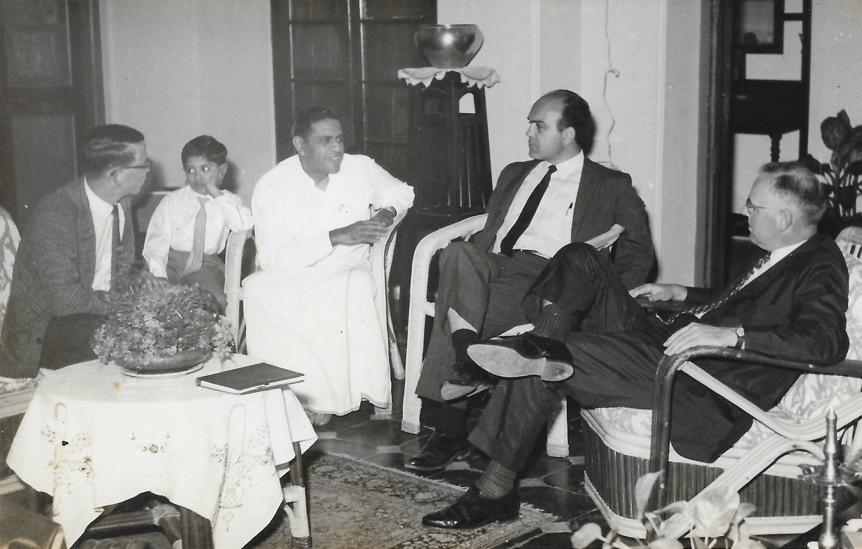 Alladi Ramakrishnan in conversation with Professors Bruno Zumino and McCrea Hazlett at Ekamra Nivas. To Ramakrishnan's right are eight year old Krishna and Hazlett's son.