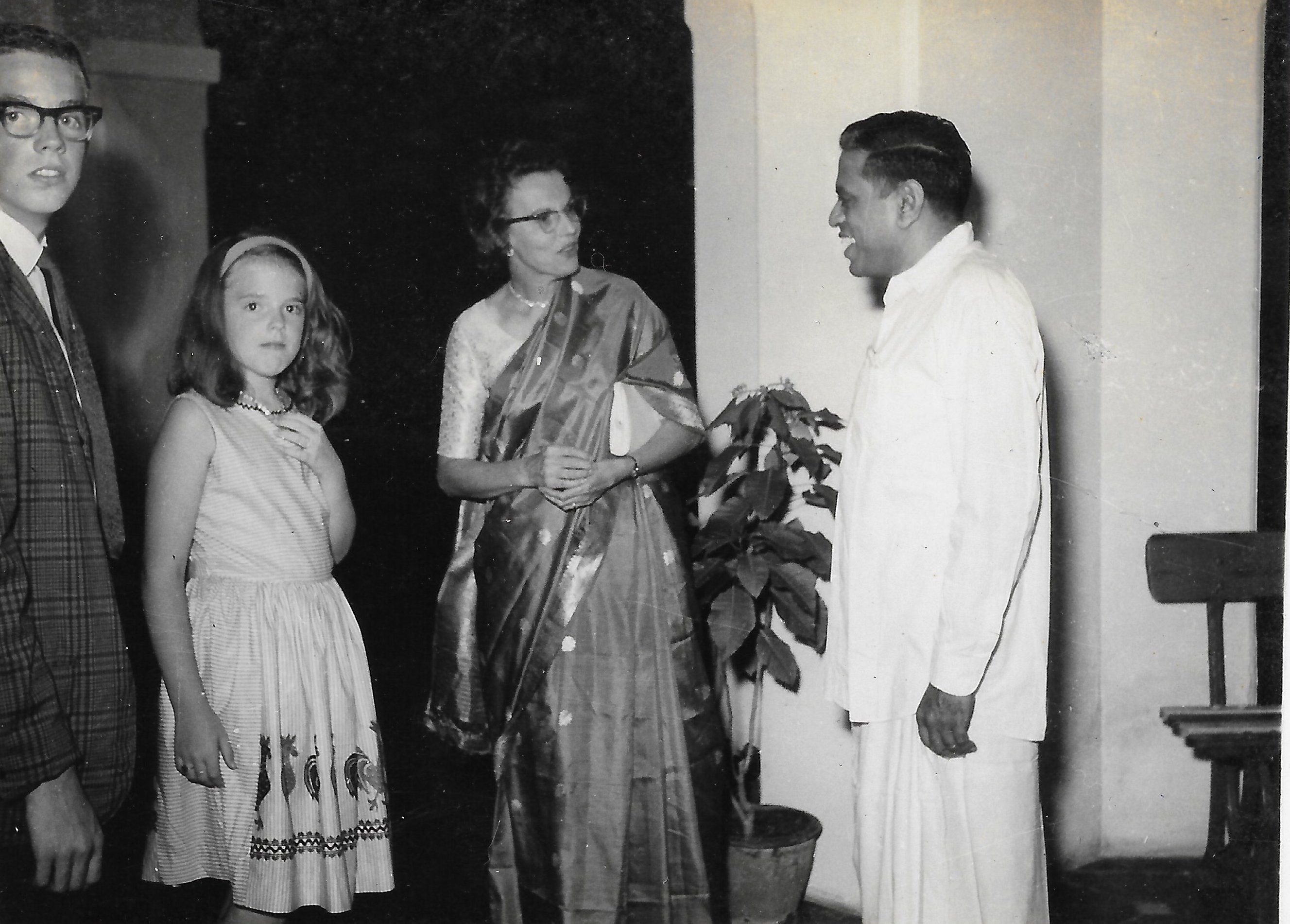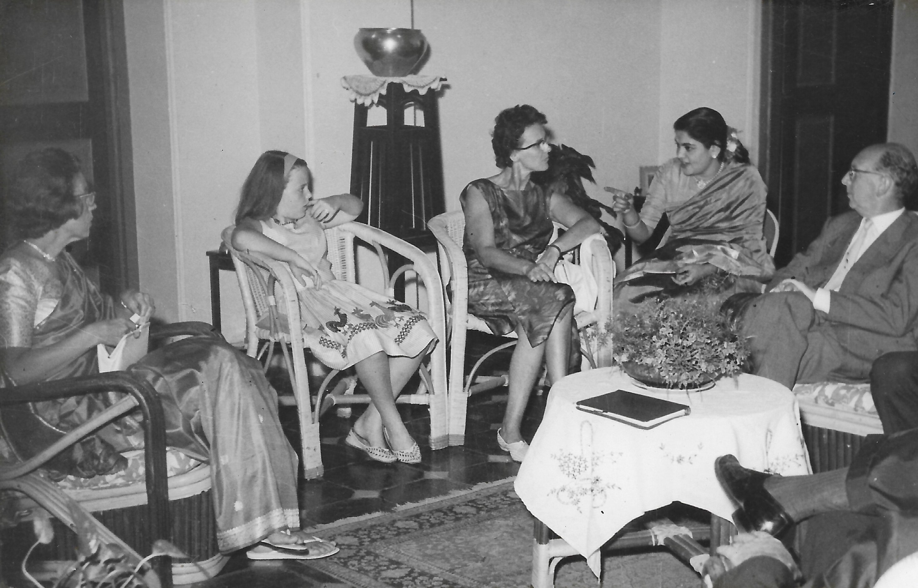 Lalitha Ramakrishnan in conversation with Mrs. Rosenfeld and Mrs. Hazlett at Ekamra Nivas. Leon Rosenfeld is next to Lalitha.