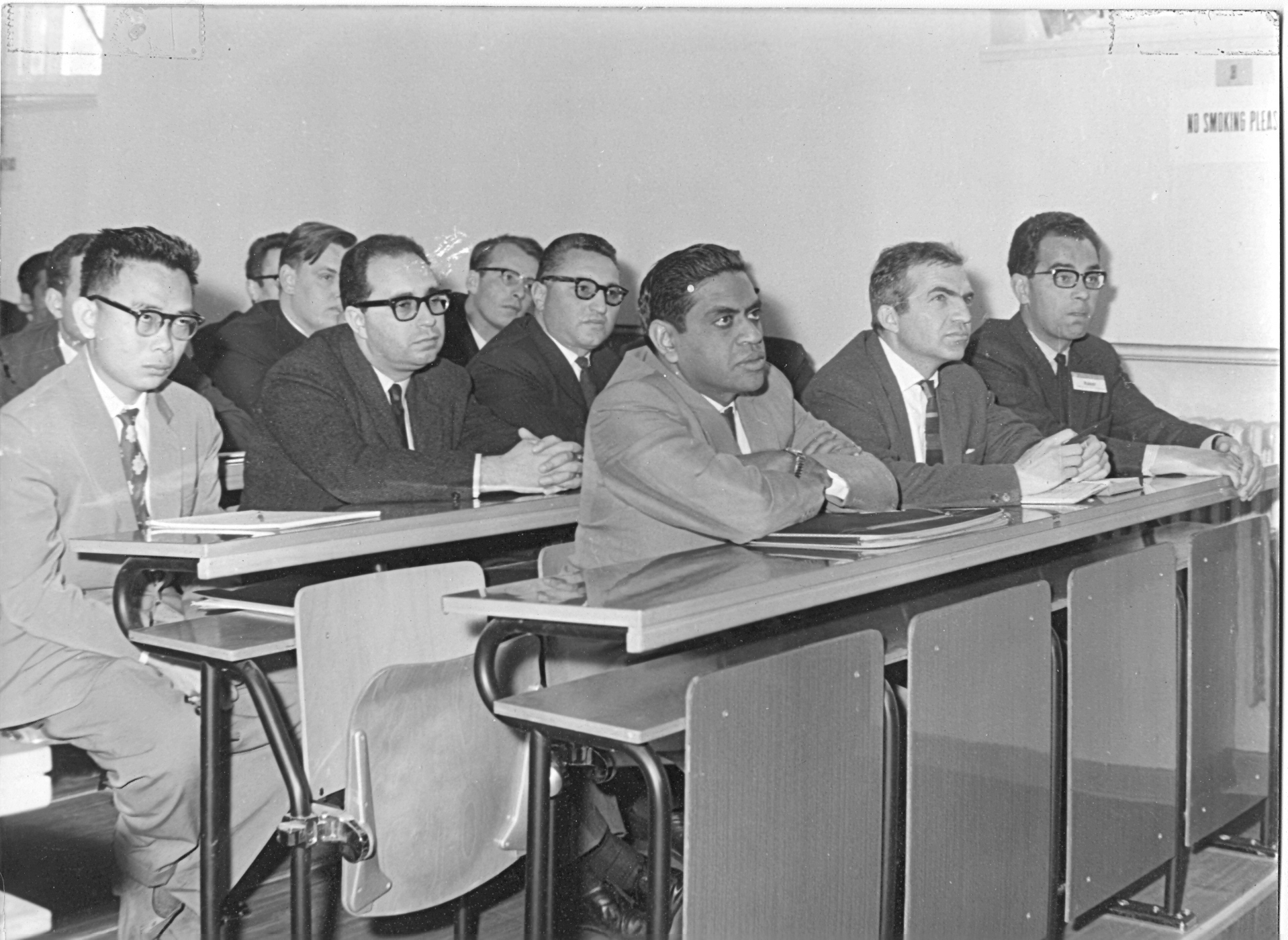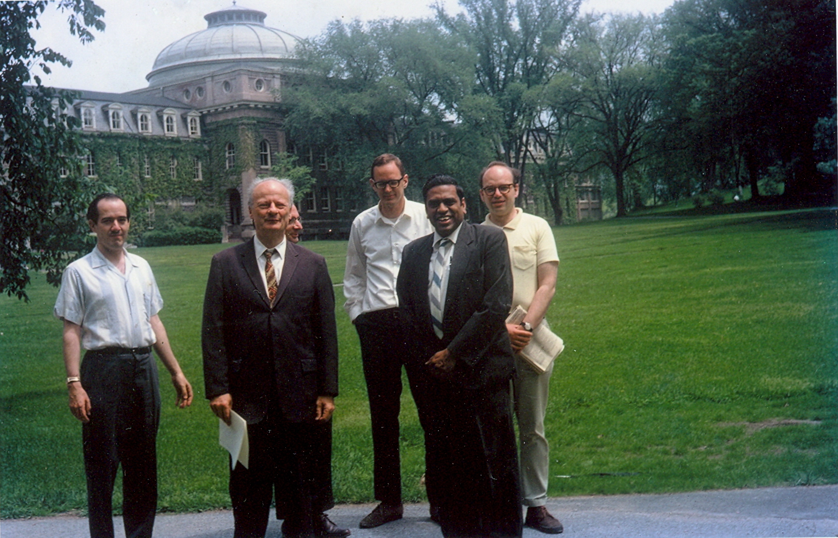 OVERSEAS TRIPS OF ALLADI RAMAKRISHNANProfessor Alladi Ramakrishnan believed that close interaction with the the leading scientists around the world was essential for fundamental research. He traveled annually to present his work at conferences and universities worldwide. He has lectured at more than 50 international conferences, and given talks at about 200 centers of higher learning in North America, Europe, Asia and Australia. In doing so, not only did he disemminate his research work and those of his group, but also used it as an opportunity to make new contacts and invite active researchers to Madras. Among his many trips abroad, we mention a few that were especially significant in terms of his career.1949-51 Visit to England for PhD at the University of Manchester under M. S. Bartlett and D. G. Kendall (oxford); method of Product Densities recognized in England. 1954 Visit to Australia: lectures at the University of Sydney at the invitation of Harry Messel became the basis of the Handbuch der Physik article five years later. 1956 First Round-the-World Trip: Visit to Yukawa Hall, Kyoto; met Richard Bellman and Nobel Laureate Richard Feynman in California (the beginning of a long association with Richard Bellman); met astrophysicist Subrahmanyam Chandrasekar in Chicago; attended High Energy Physics Conference in Rochester organized by Robert Marshak and met Robert Oppenheimer there; lectured at the Max Planck Institute in Gottingen, Germany at the invitation of Nobel Laureate Werner Heisenberg which resulted in a contract with Springer for an article on probability in the Handbuch der Physik. 1957-58 Visit to the Institute for Advanced Study in Princeton at the invitation of its Director Robert Oppenheimer, after which the focus of Alladi Ramakrishnan's research turned from stochastic processes to elementary particle physics. 1960 - Trip to Europe: visited the Copenhahen Institute of Physics at the invitation of Nobel Laureate Niels Bohr; series of lectures on stochastic processes at the University of Berne at the invitation of Andre Mercier; visited Imperial College, London, as the guest of Abdus Salam; while in London, Ramakrishnan was offered a contract by the Pergamon Press to write a book on Elementary Particles and Cosmic Rays which was published in 1963. 1962 - First Round-the-World trip after assuming Directorship of MATSCIENCE: two month visit to Rand Corporation in California at the invitation of Richard Bellman; lectured at Caltech at the invitation of Murray Gellmann; spent two weeks each at Stanford University at the invitation of Leonard Schiff and at the University of California. 1964 Visit to Russia: lectured at the High Energy Physics Conference in Dubna. 1965 - Trip to Europe: two month visit to the International Centre for Theoretical Physics (ICTP) in Trieste, Italy at the invitation of its Director Abdus Salam; visits to CERN in Geneva, Saclay, Orsay and Instutute Henri Poincare in Paris. 1968 Round-the-World trip, and visit to Europe: Lectured at Cornell University at the invitation of Nobel Laureate Hans Bethe (contact with Bethe resulted in Bethe visiting MATSCIENCE in 1969); visited Moscow and Leningrad as guest of the Russian Academy of Sciences; lectured at the High Energy Physics Conference in Vienna. 1971 Visit to New Zealand to speak at the Rutherford Centennial Conference in Cristchurch. On most of his trips abroad from 1962 onwards, his wife Lalitha and his son Krishna accompanied him. It was thus a great academic experience for Krishna from an early age. We present here a sample of some overseas photographs of Professor Alladi Ramakrishnan.